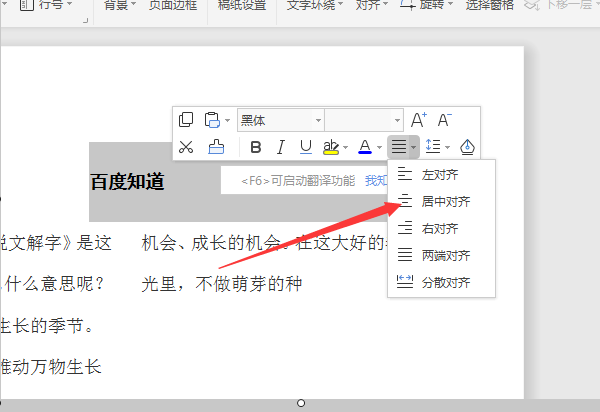 2、在进入Word文档后先选中标题并选择弹出对话框中的居中对齐选项。