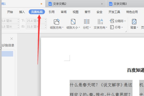 3、在设置完标题后,选中正文内容,并点击页面上方的页面布局选项后,打开页面布局工具栏。
