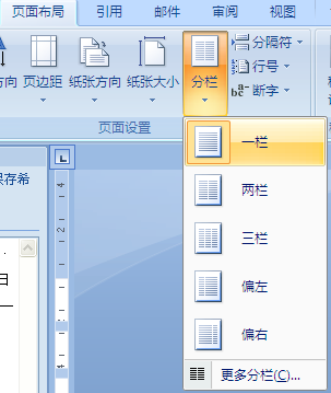 单击“页面布局”选项卡,在“页面布局”功能区中单击“分栏”按钮,打开一个下拉菜单,如下图所示,从中选择相应的栏数即可。