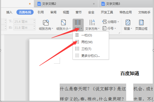 4、在页面布局工具栏中选择分栏选项下的两栏选项即可将正文内容分为两栏。