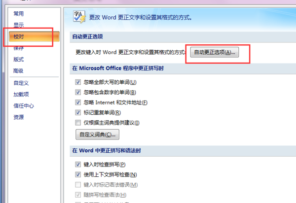 二、在“校对”选项内点击“自动更正选项”。