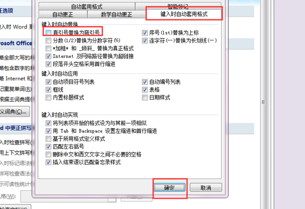 三、“键入时自动套用格式”选项卡下取消勾选“直引号替换为弯引号”,点击“确定”,关闭Word选项。
