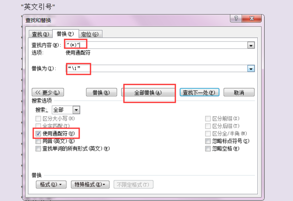 2.打开Word替换对话框,在查找框内输入("*")(英文引号和*号。注意只输入括号内的符号,括号本身不要输入,下同),选中“使用通配符”,然后在替换框内输入(^&^c),C要小写。把光标放在文档的开始处,单击“全部替换”,经过替换之后,我们看到文中所有的英文下引号都由单个(")变为双个("")了,这是为后面Word区分英文上引号和下引号打基础。