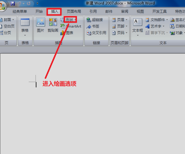1、新建一个空白Word文件,点击“插入”选项,会出现一个“形状”的菜单栏,进行点击。
