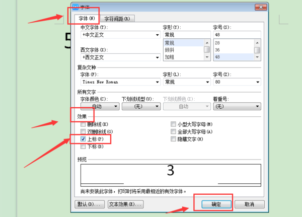 2、在弹出的字体设置框里,效果下面的“上标”前面打上勾,点击下面的确定;