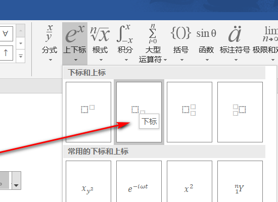 5、对于公式下标而言,只需在word界面上方点击“插入”选项卡,在随后打开的界面中选择“公式”,随后点击“下标”,选择一个样式,在样式中写入需要输入下标的字母即可。