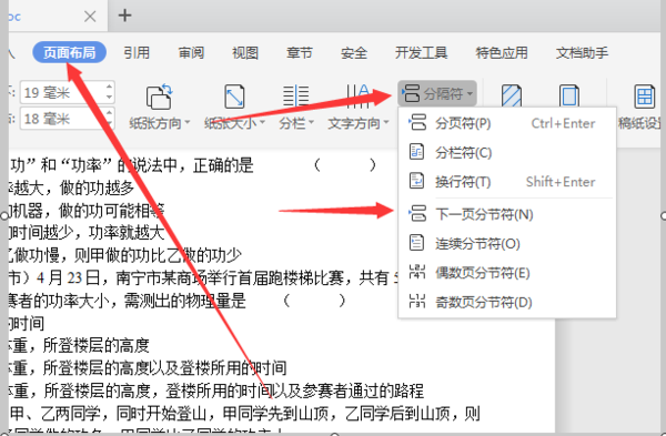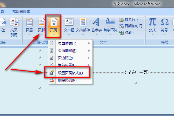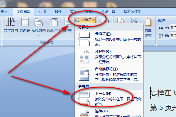 1、打开word2007文档,将光标定位到“指定页”的前一页末尾,单击“页面布局”菜单,单击“分隔符”菜单,单击“分节符”下方的“下一页”命令。