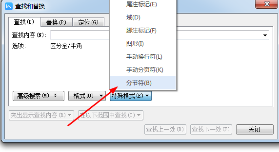 第二步,使用快捷键Ctrl+F调出查找命令对话框,点击特殊格式---分节符,然后把这些分节符全部替换为空白的空格就可以了。