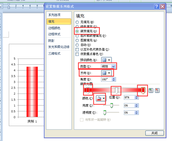 当然可以,右击插入的柱图,“设置数据系列格式”,在“填充”页,选中“渐变填充”,“类型”选择“线性”,“方向”选择“线性向右”或“线性向左”,然后设置“渐变光圈”,中间的游标设置为白色,两边的游标为另一色,如图: