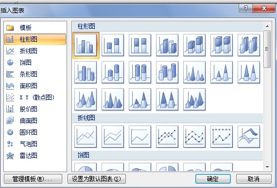 3、在出来的“插入图表”对话框中,选择中意的图表样式,在此我们以选“堆积圆柱图”为例,选择好点击“确定”: