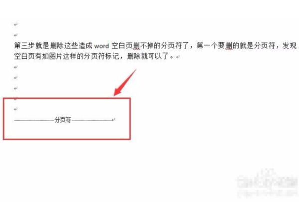4、删除这些造成word空白页删不掉的分页符了,第一个要删的就是分页符,发现空白页有如图片这样的分页符标记,删除就可以了。