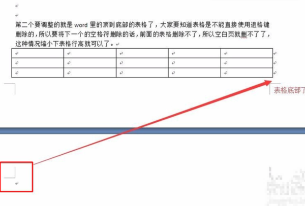 5、要调整的就是word里的顶到底部的表格了,大家要知道表格是不能直接使用退格键删除的,因为表格后面一定有个回车符,而且这个回车符是删除不了的,造成前面的表格删除不了,所以空白页就删不了了,这种情况稍微调整下表格行高就可以了。
