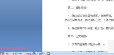 2、打开你的文章后,我们直接可以在文档左下角可以看到一个统计数据,页面,字数,在这边可以看到字数571,有两个页面