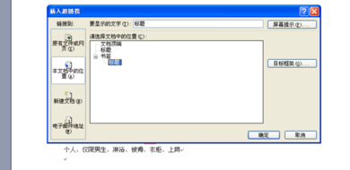 "插入超级链接"对话框分为上下两个部分:在上半部分的带下拉式列表框的文 本编辑框中用来输入超级链接目标文档的路径或Internet地址,在下半部分的文本编辑 框用来输入所要链接到的目标文档中的位置。因为要链接到的是当前文档中的书签位 置,所以不用在"链接到文件或URL"文本编辑框中输入任何内容。 用鼠标单击"文件中有 名称的位置"文本编辑框右侧的"浏览"按钮,这时"书签"对话框出现。用鼠标在"书签"对 话框中的书签类表框中单击选定超级链接的目标书签,按"确定"退出"书签"对话框。在" 插入超级链接"对话框的"文件中有名称的位置"文本编辑框中即出现所选定的书签名称, 用鼠标单击"确定"按钮,完成插入超级链接的操作。此时,文档中所选定的文本部分 下方出现一条蓝色的下划线,用鼠标单击文本中的任何一处,即可跳转到相应的书签位置。