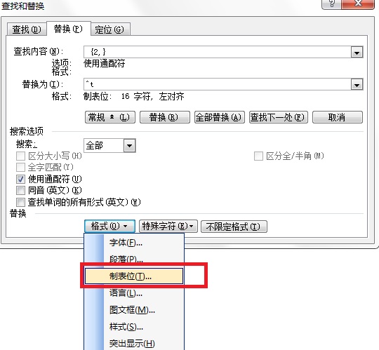 以下是重点——在查找内容{2,}的前边是一个空格;光标定位在^t后边,然后点击“格式”——制表位