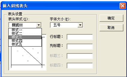 3、弹出插入斜线表头对话框,在表头样式处,选择所需要的样式;在行标题、列标题后面的输入框中输入需要的内容即可,如图所示