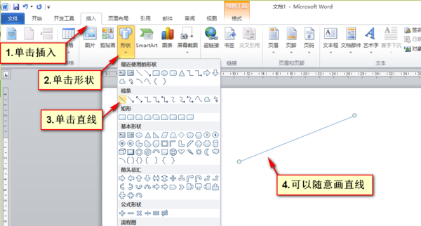 使用直线工具就可以直接画直线,以office word 2010为例,步骤如下图: