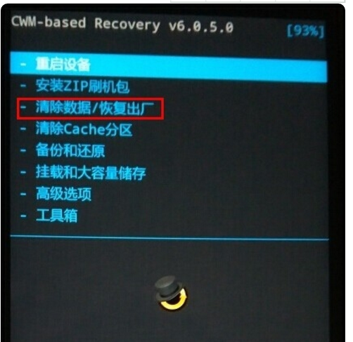 进入recovery模式后,选择对手机进行双清(双wipe),然后移动选择【清楚数据/恢复出厂】,接着继续选择【是的-清楚所有数据】,然后电源键确认,如下图