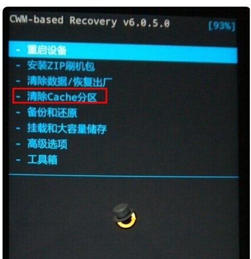 返回recovery主界面,移动选择【清楚Cache分区】,接着继续选择【是的-清楚Cache分区】,然后电源键确认,如下图