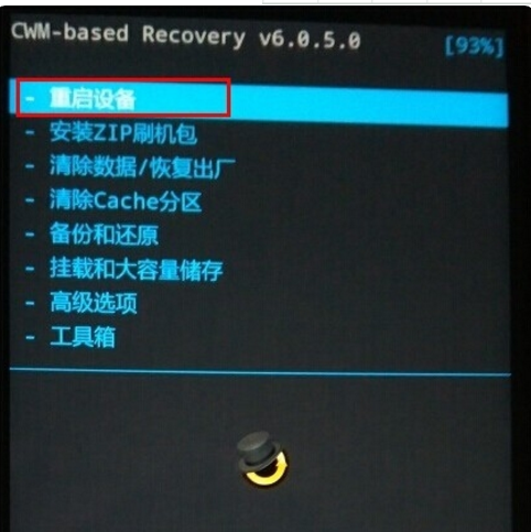 待刷机包刷入完成后,返回到recovery主界面,选择【重启设备】