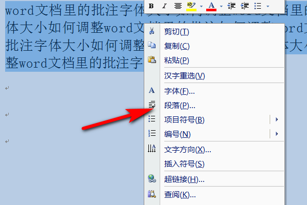1.在有些word文档中,编辑文字格式时,有时看到段落两行字间距很大,需要将行间距调小。打开word文档,选中需要调整行间距的文字,按鼠标右键,在显示的菜单中选中段落。