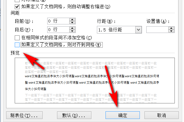 2.在打开的段落属性界面中,找到间距那一项,去掉“如果定义了文档网络,则对齐到网格”前面的勾。