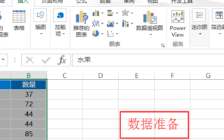 1、准备好测试数据,在A列输入“水果”,在B列输入“数量”。在水果处任意输入名称及数量。