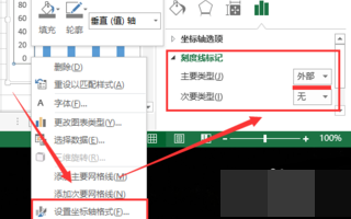 4、纵轴上加上刻度:鼠标右键点击纵轴,在弹出菜单栏中选择”设置坐标轴格式“。并找到”刻度线标记“,将主要类型,设置为”外部“(其他版本的excel默认已设置)。