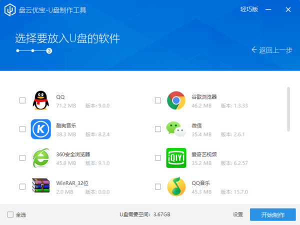 第四步:选择要放入U盘的软件,并点击“开始制作”,只需耐心等待,U盘制作成功会自动提示。