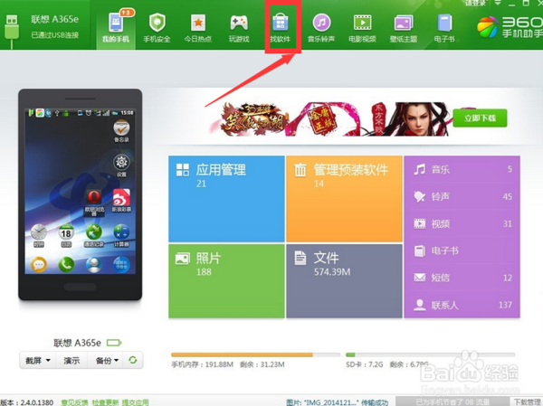 例如,将手机连接电脑,并在电脑上装载诸如360手机助手、应用宝之类的软件,