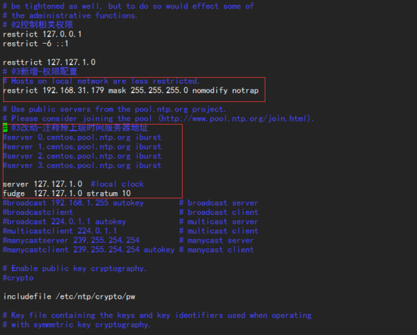 # @3新增-权限配置restrict 127.127.1.0restrict 192.168.31.0 mask 255.255.255.0 nomodify notrap# @3改动-注释掉上级时间服务器地址#server 0.centos.pool.ntp.org iburst#server 1.centos.pool.ntp.org iburst#server 2.centos.pool.ntp.org iburst#server 3.centos.pool.ntp.org iburst# @4新增-上级时间服务器server 127.127.1.0 # local clockfudge 127.127.1.0 stratum 10