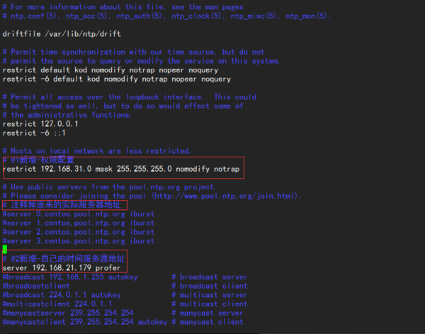 # @1新增-权限配置restrict 192.168.31.0 mask 255.255.255.0 nomodify notrap# Use public servers from the pool.ntp.org project.# Please consider joining the pool (http://www.pool.ntp.org/join.html).# 注释掉原来的实际服务器地址#server 0.centos.pool.ntp.org iburst#server 1.centos.pool.ntp.org iburst#server 2.centos.pool.ntp.org iburst#server 3.centos.pool.ntp.org iburst# @2新增-自己的时间服务器地址server 192.168.31.223 prefer<==以这部主机为最优先#broadcast 192.168.1.255 autokey # broadcast server#broadcastclient # broadcast client#broadcast 224.0.1.1 autokey # multicast server#multicastclient 224.0.1.1 # multicast client#manycastserver 239.255.254.254 # manycast server#manycastclient 239.255.254.254 autokey # manycast client