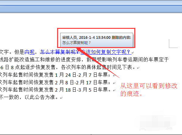 6、对文档进行删除或者增加文字的时候,系统会自动添加修改人的信息已经进行的操作和操作时间以及操作内容。
