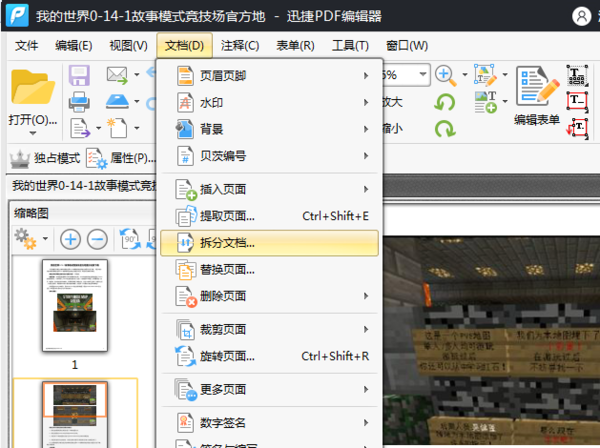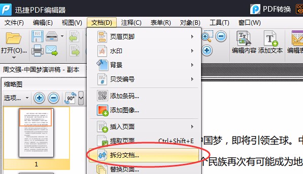 当我们打开需要拆分的PDF文件后,点击“文档”按钮,在弹出的目录中选择“拆分文档”。