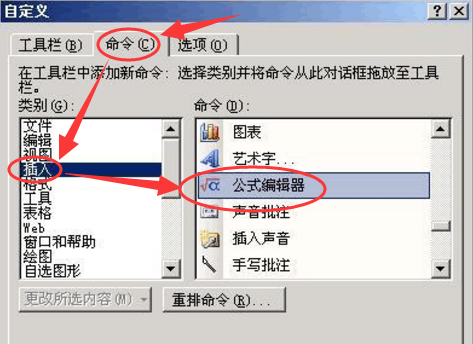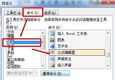 2、在随后打开的【自定义】对话框中,选择【命令】选项卡,先选择左边“类别”中的插入,在右面的“命令”中就可以找到公式编辑器了。