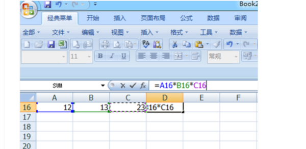 2.将鼠标移动到自己所需要的单元格中,然后在输入公式的上方输入自己想要计算的公式,如“=A16*B16*C16”, A16、B16、C16表示乘数的位置,而中间的“*”就表示乘的意思;
