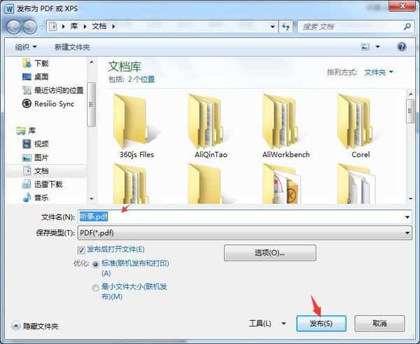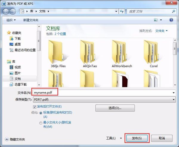 3、输入要创建PDF文件名,点击“发布”按钮,如图: