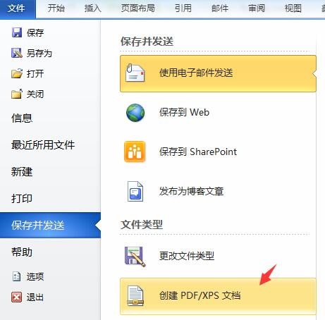 1、进入word2010,打开需要转换的文档,点击“文件”菜单中的“保存并发送”,同时选择“创建PDF/XPS文档”,如图: