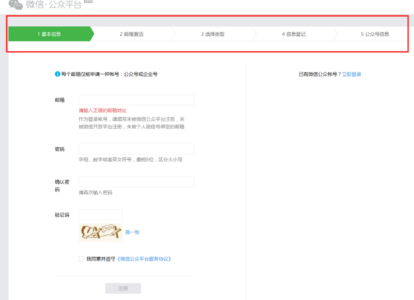 注意:作为登录帐号,请填写未被微信公众平台注册,未被微信开放平台注册,未被个人微信号绑定的邮箱