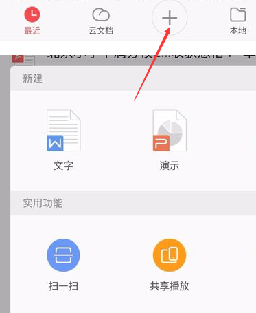 2、下载完毕后打开wps,准备新建word。点击页面最下面的“+”图标,进入新建页面。出现新建页面后,点击“文字”图标。