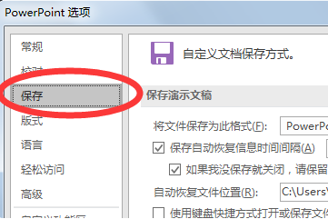 4.点击左面的菜单栏中的“保存”,并在右方“保存演示文稿”下的“自动回复文档位置”中复制恢复文档的地址“。这里是我的,以你的位置为准。复制之后点击“确定”将它关闭。