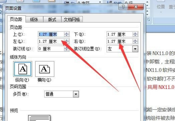 应该就是在margins设置的,你设置了上3厘米下2厘米左3厘米右两厘米的时候,你还要考虑一下页眉页脚的设置看看。