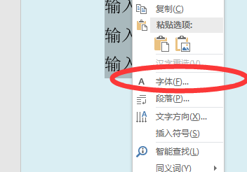 2、然后右键点击选中的文字,在弹出的选项中点击“字体”。