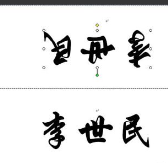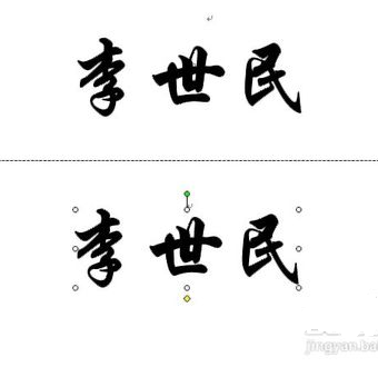 5、选中上方的艺术字,按住绿色的控制点,使用艺术字进行180度旋转。旋转时可以多试几次,反正要使用艺术字处理水平状态两边看都是顺序。