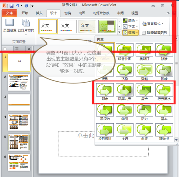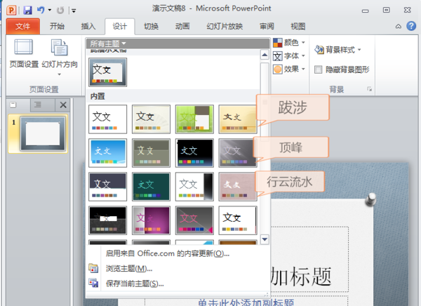 在某些特殊情况下(如计算机等级考试一级MS OFFICE),需要在OFFICE PPT 2010中应用指定的系统自带的某个主题:如“活力”、“行云流水”等,一般是从设计——主题——其他——内置进入后,将鼠标悬停在各个主题上,等待出现文字提示,即慢又难找,在考试中会耽误很多时间,弱智考法让人心烦。百度无果,现有一个能够快速找到某主题的简易替代解决方法,供大家参考。