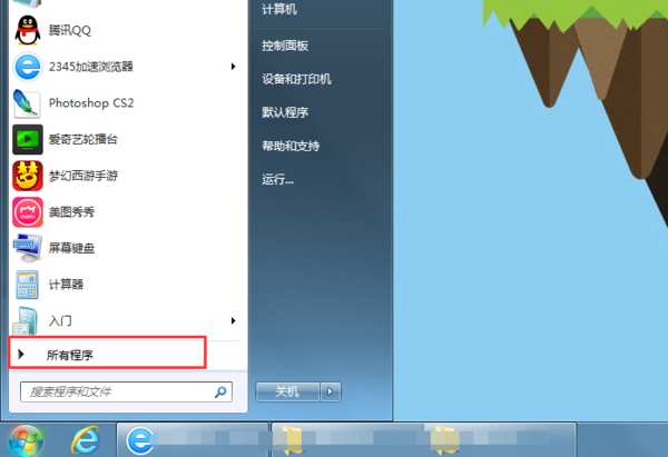 一、按下键盘上的“Win键”,弹出开始菜单后,点击“所有程序”。