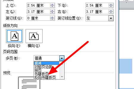 3、然后我们点击打开页面设置后面的小箭头,选择多页中的“反向书籍折页”即可。