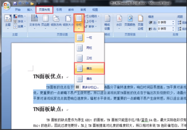 五、选择要分栏的文字,然后单击页面布局,分栏,偏左。