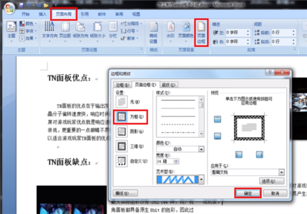 八、接下来。制作小报的边框,依次单击页面布局,页面边框,然后选择方框,选择合适的艺术型后,单击确定。