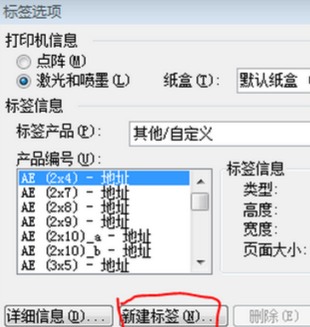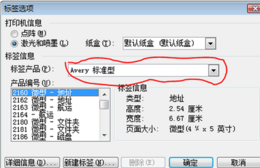 4.到这一步,我想大家应该注意了。如上图红笔画过的地方,那是标准标签版面的排版方法。而我们所用的标签纸是不是标准的呢?我想应该不是的,至少我所用的就不是的,所以这时就要单击红笔所圈处的下拉箭头,选择最下面的“其他/自定义” 。